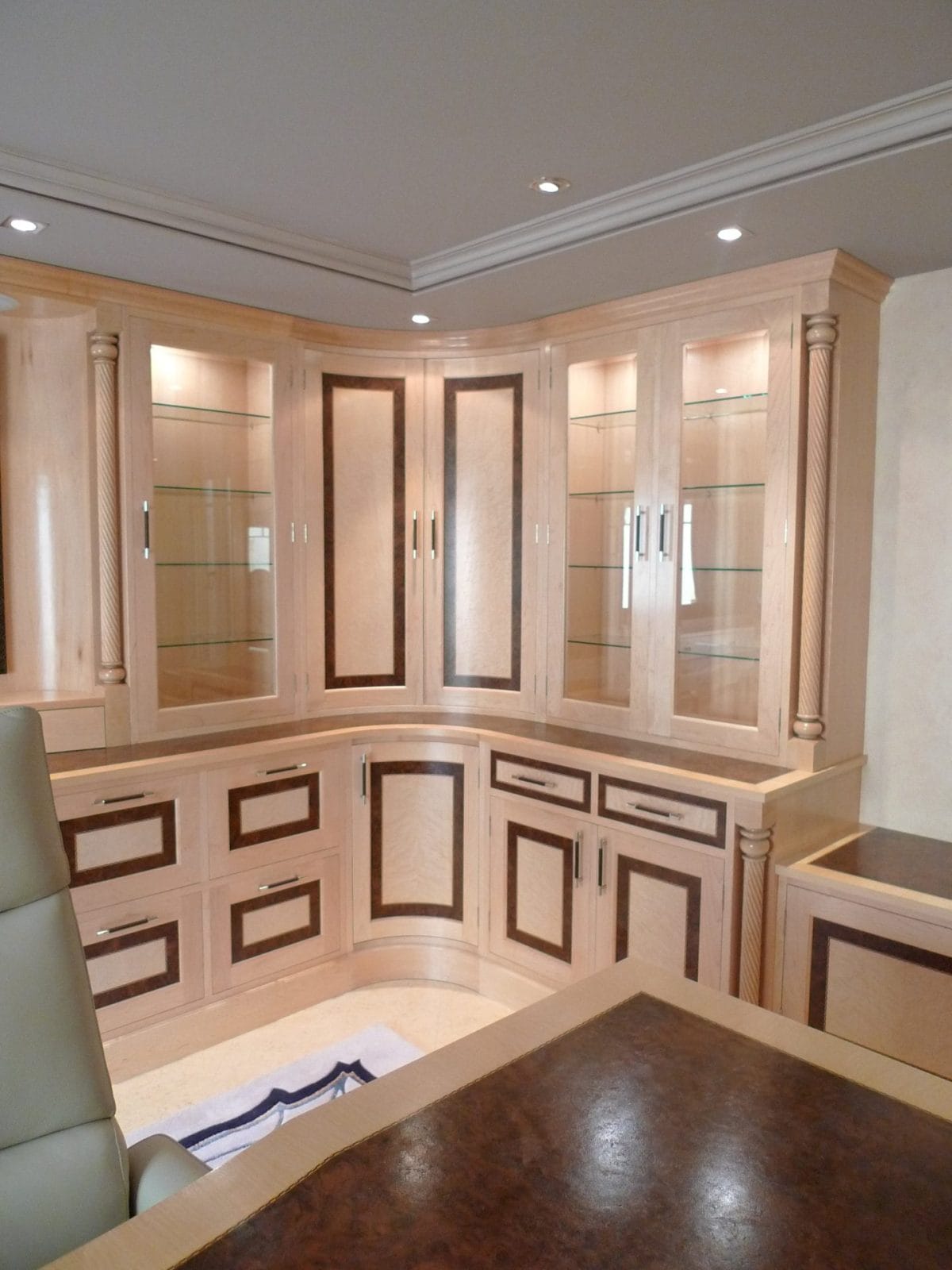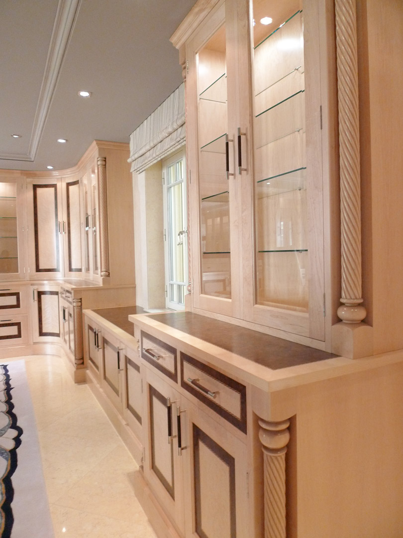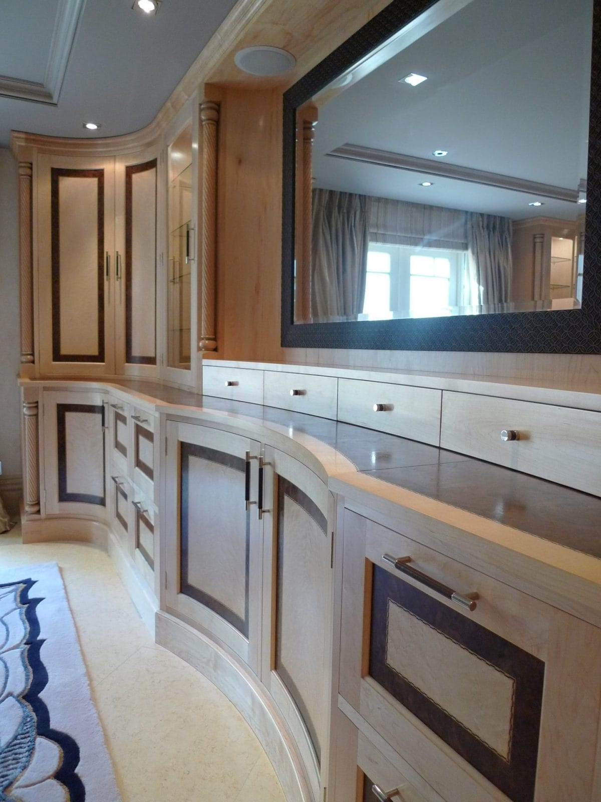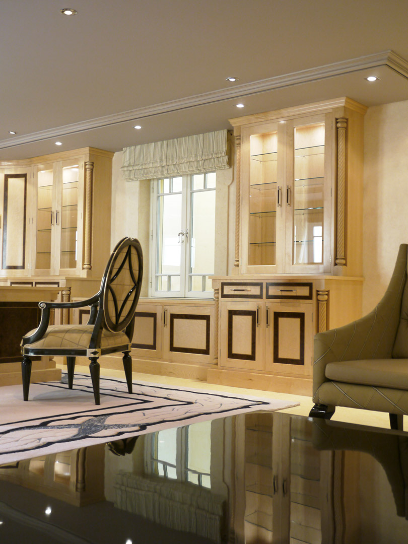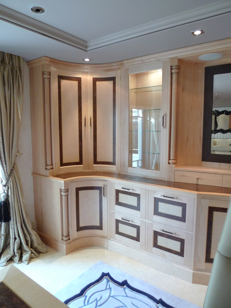 Designed specifically with the client and all details selected such as the curved drawers and display units, turnings on the fitted furniture and matching desk all the way through to the unique handles, solid maple plinth and cornice.