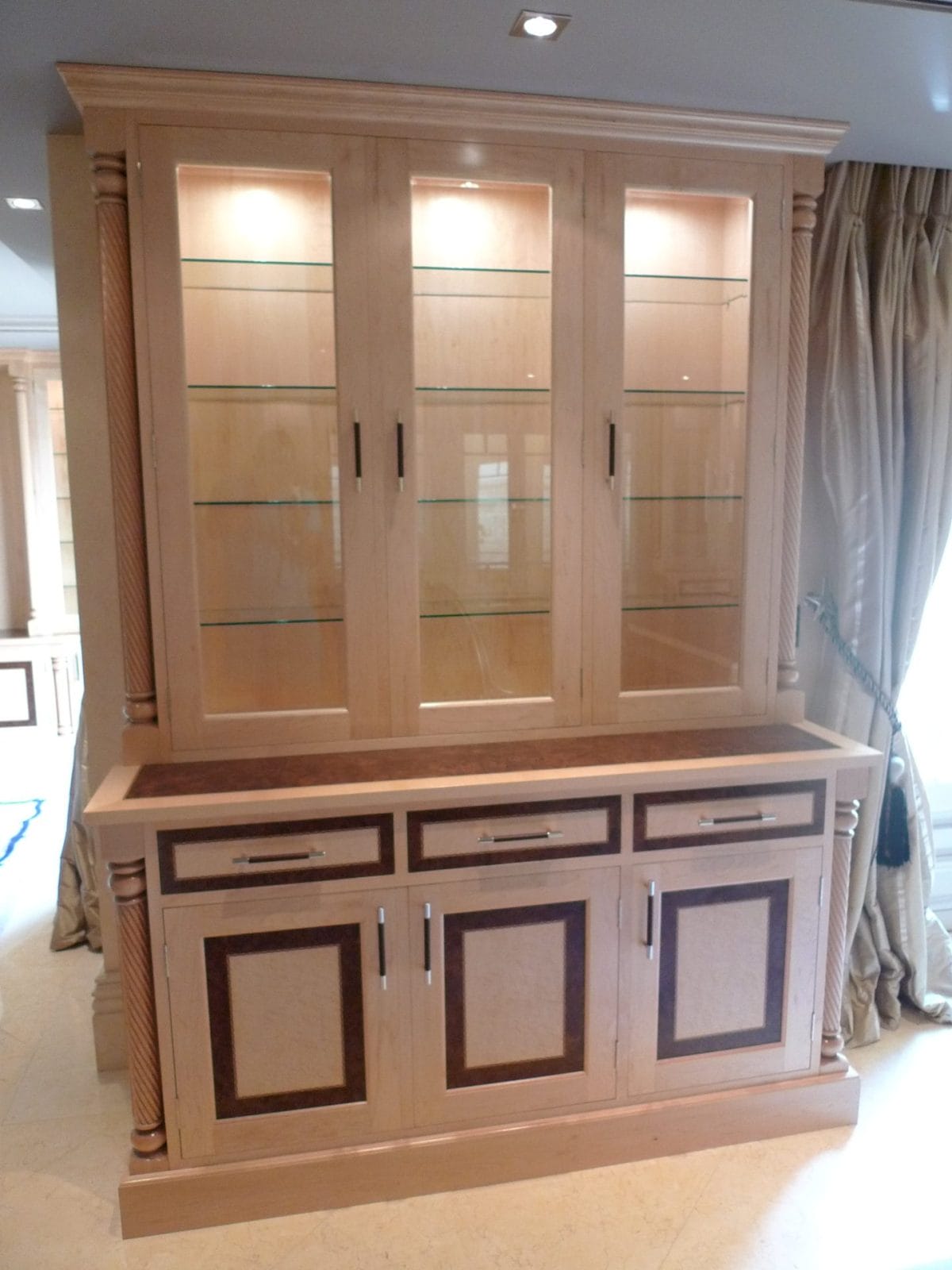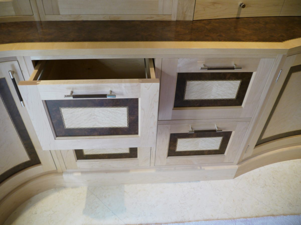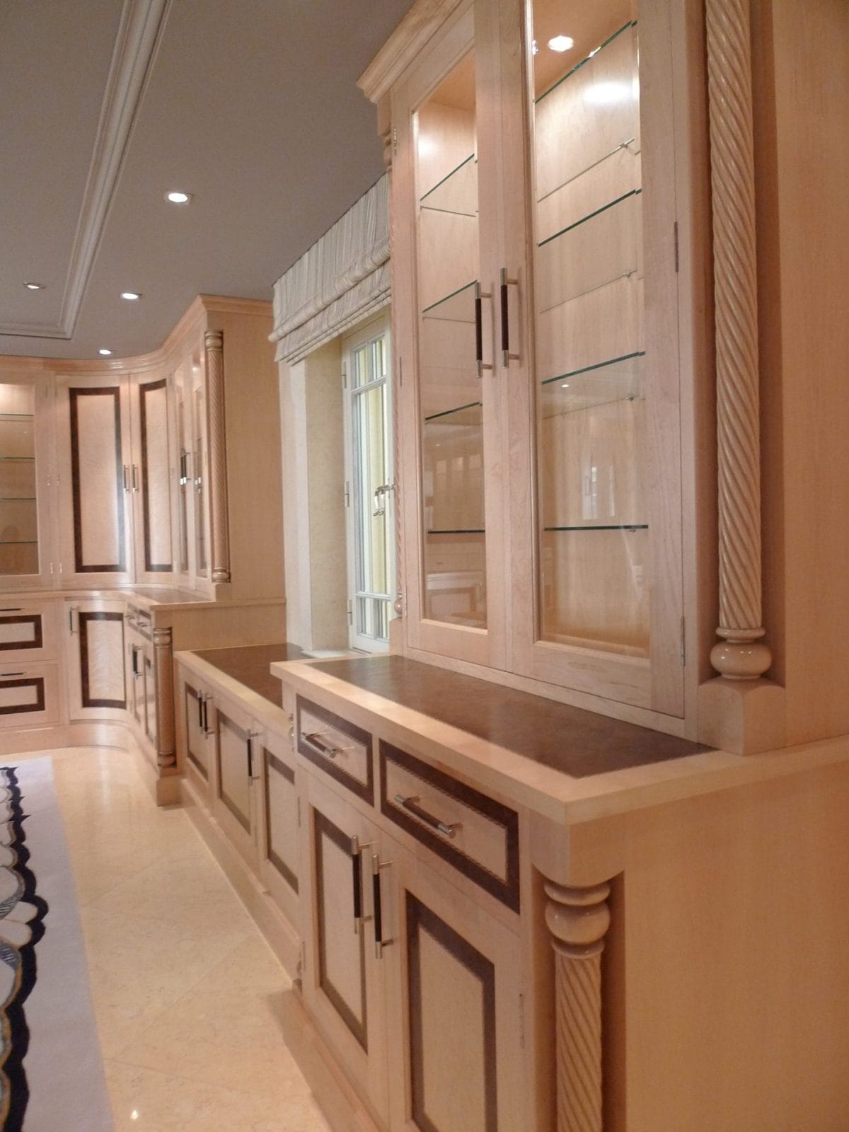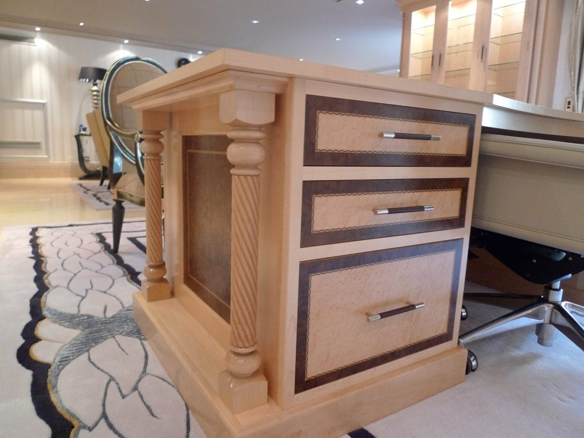 Designed specifically with the client and all details selected such as the curved drawers and display units, turnings on the fitted furniture and matching desk all the way through to the unique handles, solid maple plinth and cornice.