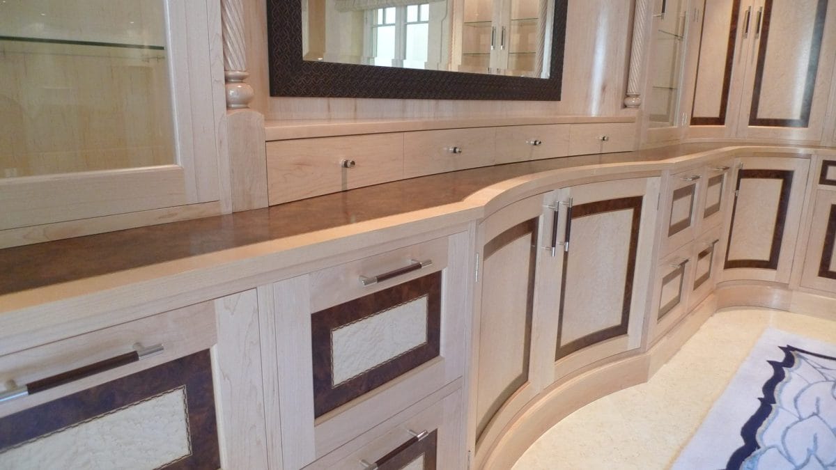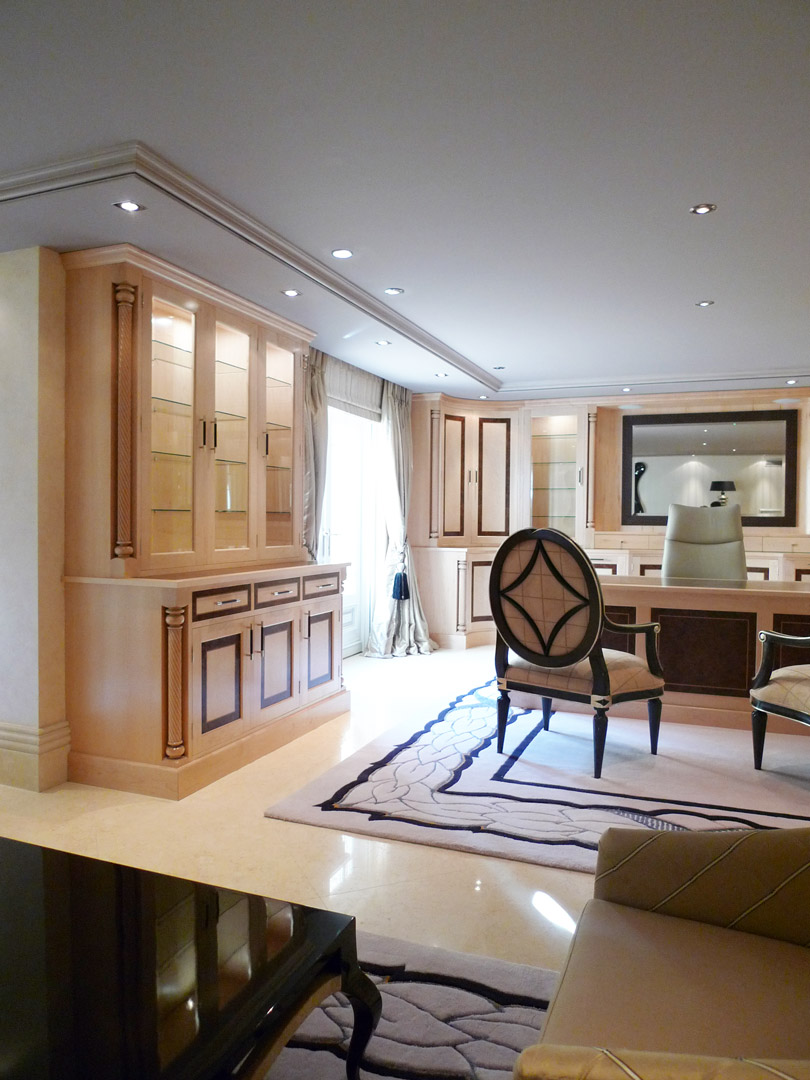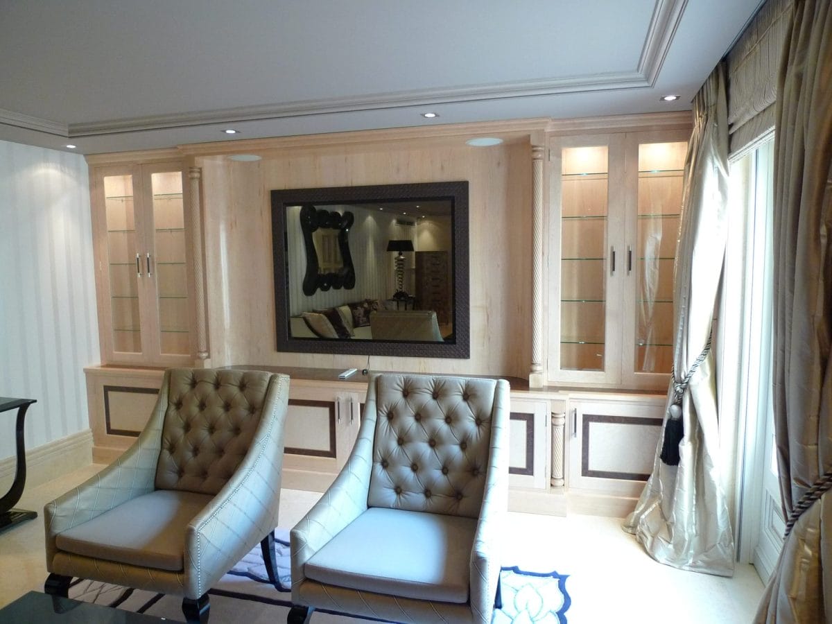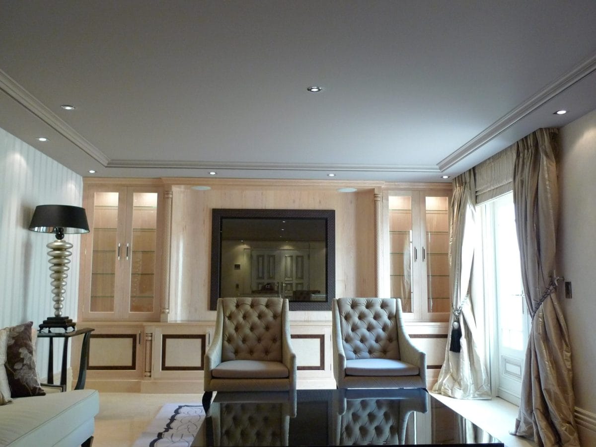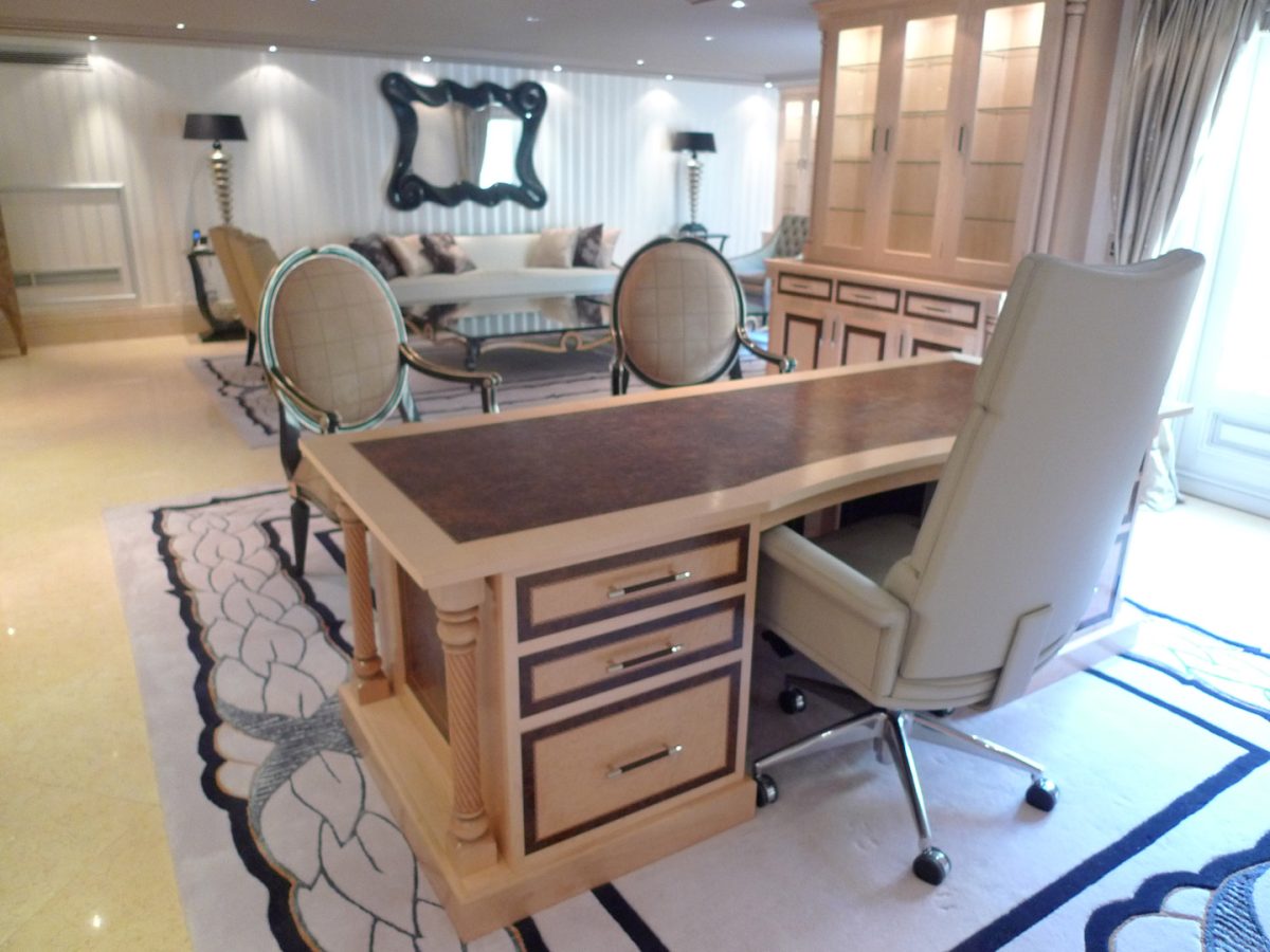 Designed specifically with the client and all details selected such as the curved drawers and display units, turnings on the fitted furniture and matching desk all the way through to the unique handles, solid maple plinth and cornice.
