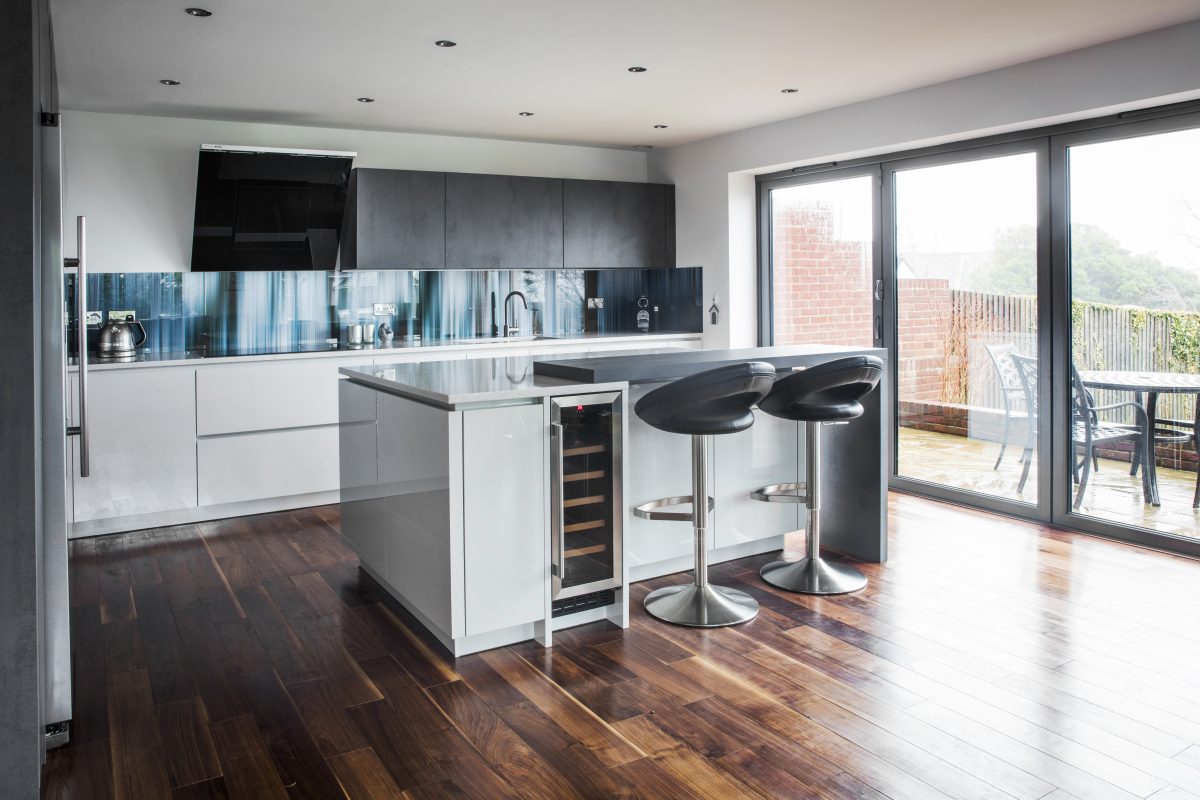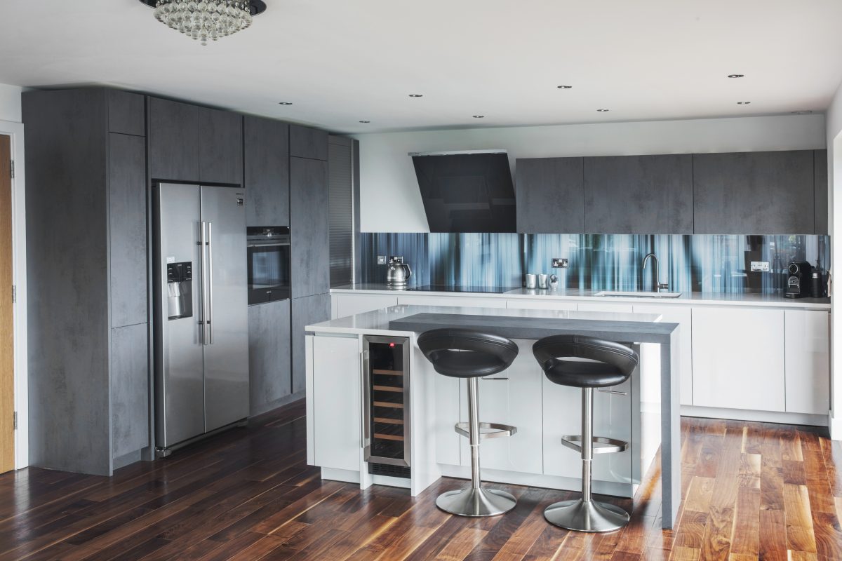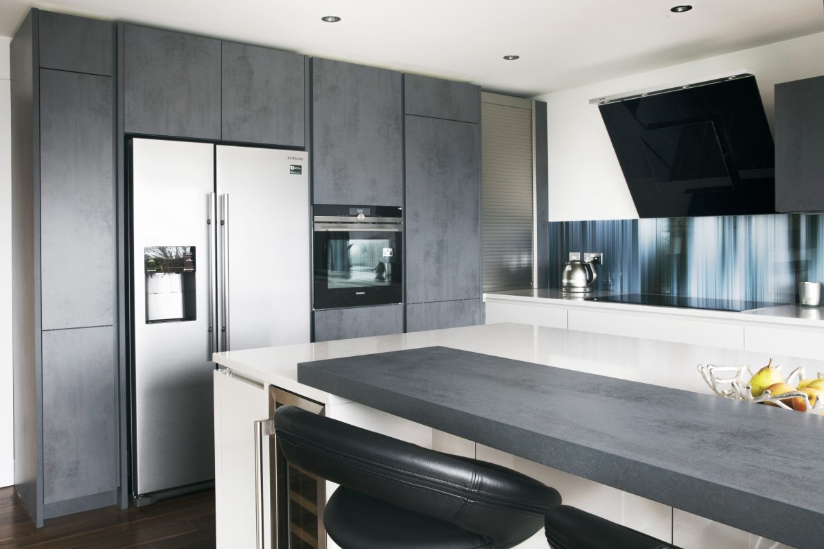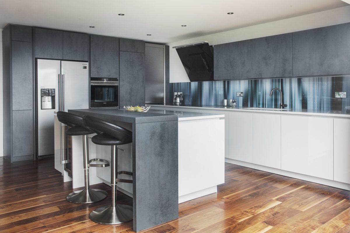 This project relocated the clients’ kitchen to the front of the property, to take in views and create a living-kitchen space for all the family to enjoy. Concrete effect doors combine with light grey laminate doors. Paired with a matching Silestone quartz worktop and the same concrete breakfast bar. These industrial finishes are offset by the dramatic printed glass splashback and wooden floor.